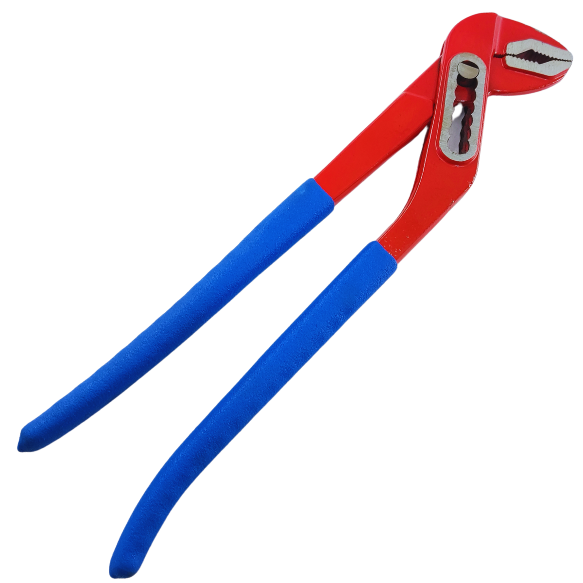 O Alicate bomba dágua em aço carbono fosfatado, É forjado, temperado e avermelhado. Cabo ergonômico e bicolor, para mais proteção e melhor aderência Ranhuras internas para regulagem confortável e segura. Mandíbula ovalada para mais torque e versatilidade, para tubos cilíndricos, quadrados, hexagonais, mordente com abertura regulável. Ideal para porcas e roscas com diâmetros maiores, indispensável em instalação de bombas, registros, boias, válvulas, etc.