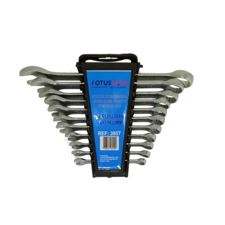 Chave combinada, em aço CRV (Liga de carbono, cromo, vanádio e outros elementos) super resistente a impactos manuais e a oxidação, cromado, com chaves de boca combinadas, em conveniente suporte de plástico rígido