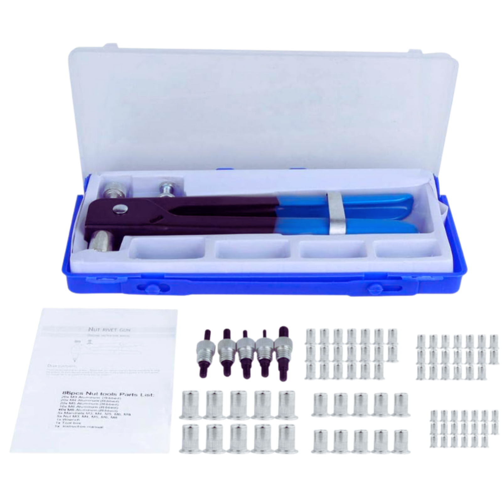 Bem vindos a LOJA O FERRAMENTEIRO. Buscamos sempre o bom atendimento aos nossos clientes, através de produtos de qualidade e segurança. Rebitador Manual para rebites de Rosca. Especificação: - Indicado para a fixação de rebites de rosca em locais de difícil acesso. Uso automotivo e industrial. - Cabo tubular de aço; - Cabo revestido em PVC; - Mandris roscados de aço cromo molibdênio; - Capacidade do rebitador para rebites de rosca: M3, M4, M5, M6 e M8. - Mantenha a alavanca fechada para substituir o parafuso de tração; - Após a troca, não aperte excessivamente. REBITADOR PARA REBITES COM ROSCA INTERNA PARA REBITES COM ROSCA M3, M4, M5, M6 E M8 MODELO: ALICATE ESSE ALICATE REBITADOR PODE SER USADO EM REBITES COM ROSCA INTERNA DE ALUMINIO, AÇO CARBONO E LATÃO. KIT COM 86 PÇS ESTOJO CONTEM 1 REBITADOR 5 PONTEIRAS 1 PÇ DE CADA M3, M4,M5,M6 E M8 10 REBITES COM ROSCA M3 10 REBITES COM ROSCA M4 10 REBITES COM ROSCA M5 10 REBITES COM ROSCA M6 10 REBITES COM ROSCA M8 Imagens ilustrativas. As tonalidades podem variar. INFORMAÇÕES IMPORTANTES: Todas as mercadorias são enviadas com nota fiscal. A política de garantia atende a legislação brasileira em conformidade com a plataforma. *** ATENÇÃO PESSOA JURÍDICA: Nota fiscal para pessoa jurídica, fora do estado do Paraná, está sujeito a cobrança adicional de ICMS *Substituição Tributária (Legislação Tributária 93/2016 / embasamento Art. 150, § 7 da Constituição Federal de 1988).