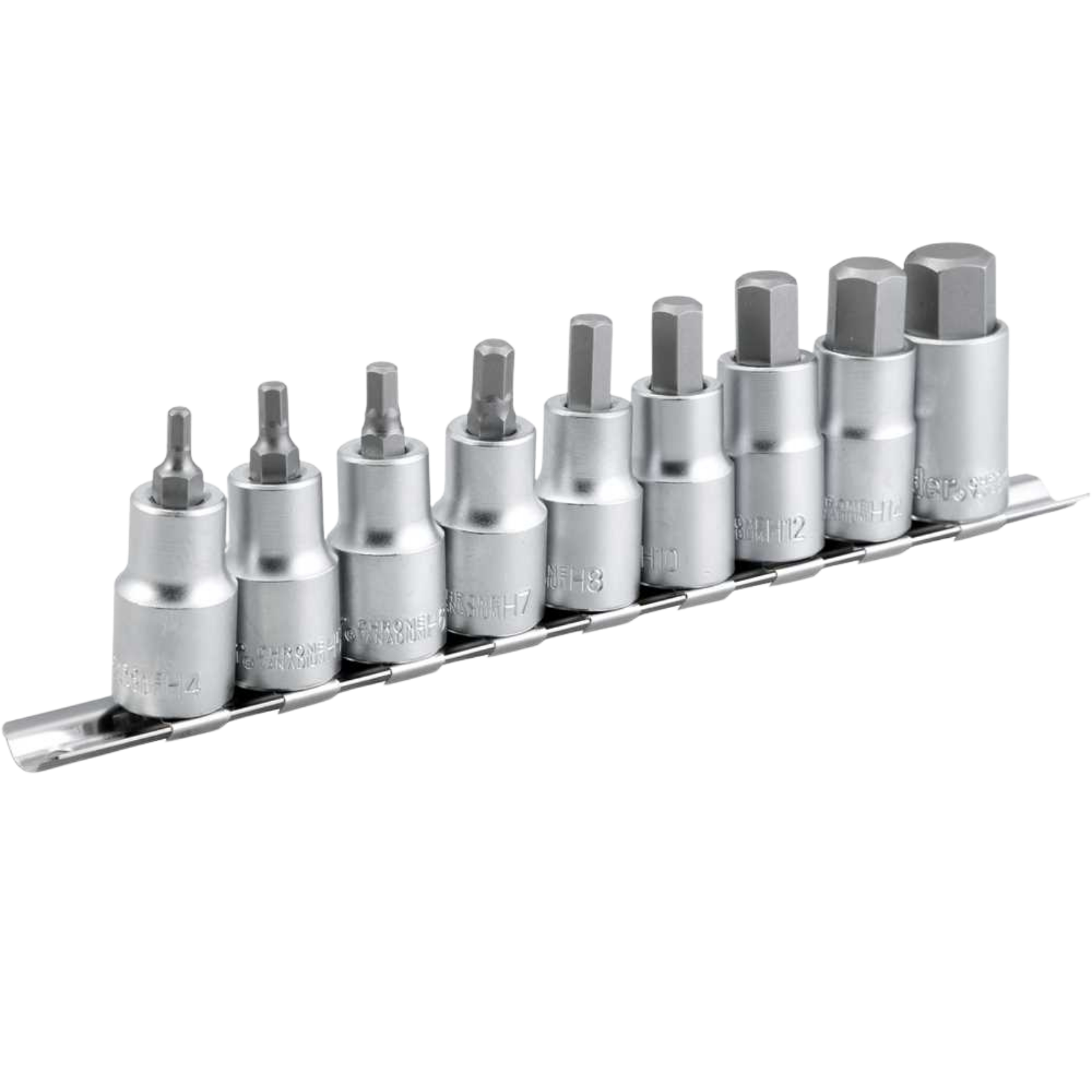 1 Jogo de soquetes hexagonais com 9 peças, sendo: 1 soquete 4 mm, 1 soquete 5 mm, 1 soquete 6 mm, 1 soquete 7 mm, 1 soquete 8 mm, 1 soquete 10 mm, 1 soquete 12 mm, 1 soquete 14 mm, e 1 soquete 17 mm.