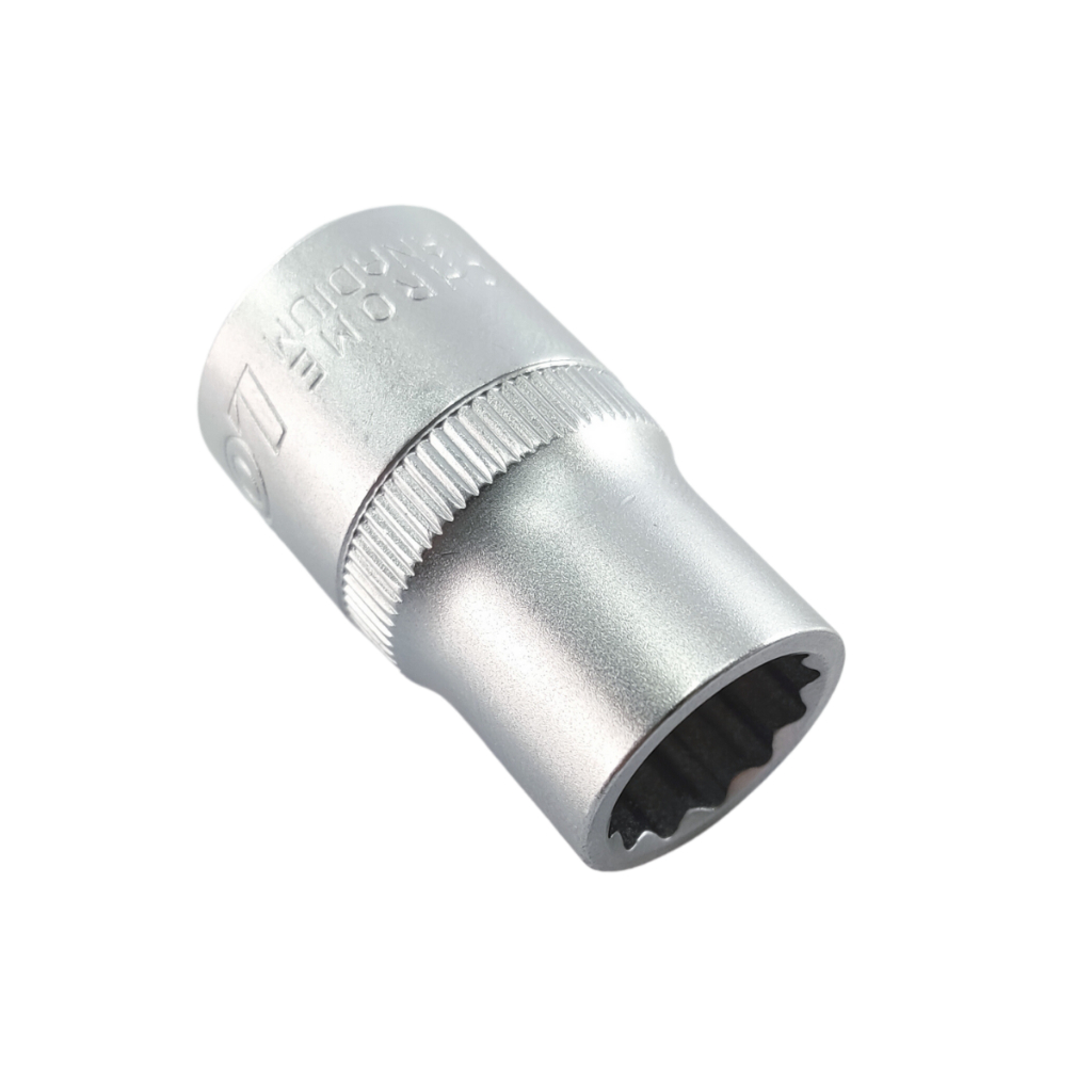 Soquetes estriados, de encaixe de 1/2, avulso com clip de pendurar, em aço cromo vanádio temperado, acabamento cromado de primeira qualidade.